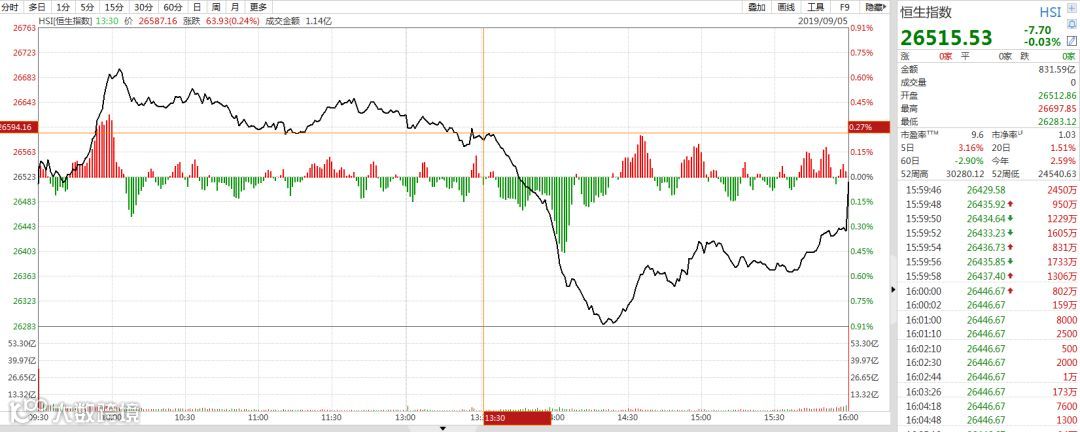 9月5日早间恒指一度拉升,午后却出现跳水,截至收盘,恒生指数跌0.03%,报26515.53点,成交额相较4日大幅减少,全天成交额831.59亿港元。