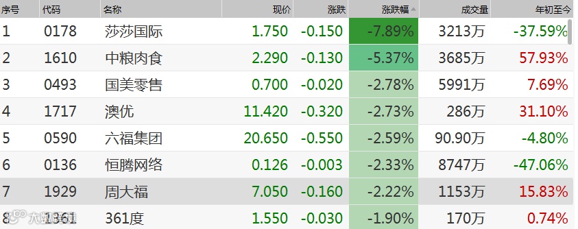 4日大涨的香港零售股5日也普遍回吐,莎莎国际大跌7.89%,卓悦控股跌7.63%,六福集团跌2.59%,周大福跌2.22%。