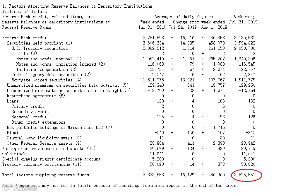 对比上图,2019年7月31日的美联储资产总规模,为38265亿美元。