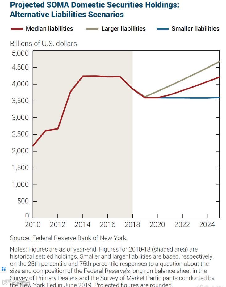 从结果来看,纽约联储这份报告已经抹除了缩表的可能性,而从现在开始到2025年,则存在5000亿美元规模的扩表空间。不过,显然这个扩表速率没有量化宽松来的局促。