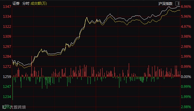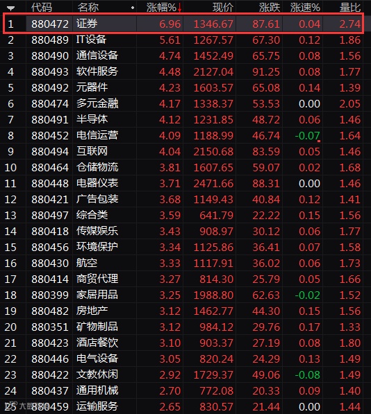 周一的两市表现非常喜气,至收盘,沪指涨2.1%,报收2883点;深成指涨2.96%,报收9328点;创业板指涨3.5%,报收1622点。连日来不温不火的券商板块,今日开始爆发式上攻,在各板块中保持领先态势。