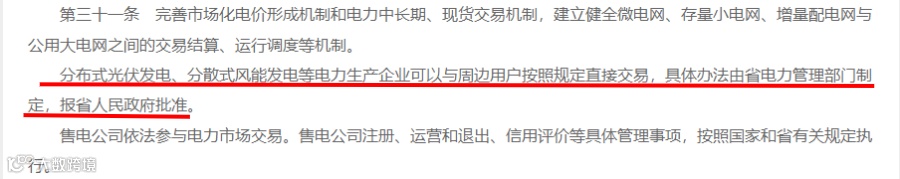 《条例》提到,供电企业应当提高电网智能化水平,增强消纳可再生能源电力的能力;其中,分布式光伏发电、分散式风能发电等电力生产企业可以与周边用户按照规定直接交易,具体办法由省电力管理部制定,报省人民政府批准。