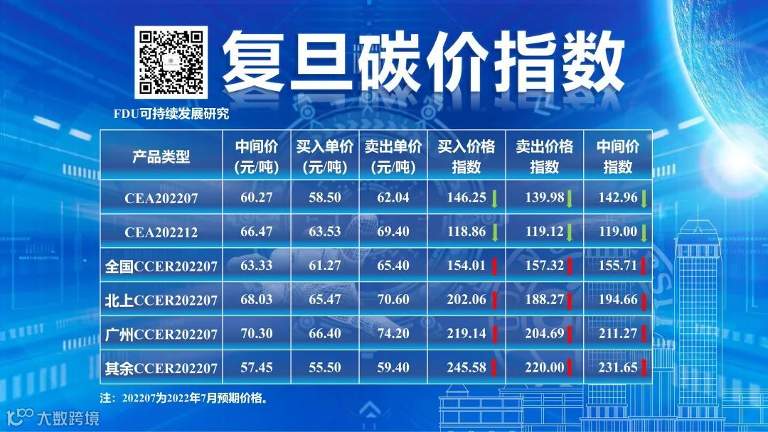 6月29日,复旦大学可持续发展研究中心(以下简称“研究中心”)公布的2022年7月复旦碳价指数结果显示,2022年7月中国核证自愿减排量(CCER)的买入价格预期为61.27元/吨,卖出价格预期为65.40元/吨,中间价为63.33元/吨,即预计仍将维持在60元/吨左右。
