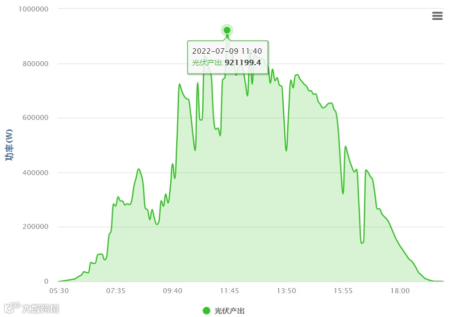 (表4 7月9日发电量数据,中午11:40为最高发电量,发电功率达921199.4W)