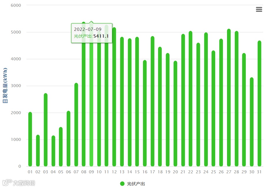 (表3 2022年7月发电量数据,7月9日为最高发电量,达5411.1kWh )