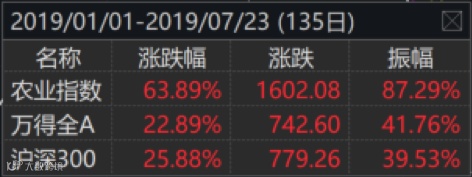 今年以来,A股农业股普遍表现强劲,在非洲猪瘟、中美贸易战等概念驱动下,农业板块相对大盘有了明显上升。在同期沪深300指数上涨25.88%的情况下,WIND农业指数暴涨了63.89%,最高涨幅甚至接近90%。