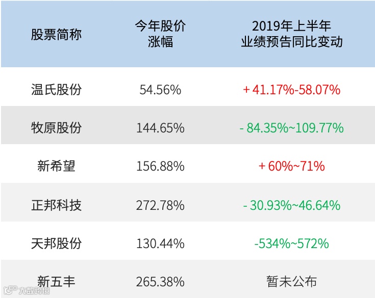 在已公布2019年上半年业绩预告的农业板块上市企业中,实际业绩只能说是喜忧参半,表现较好的依然是温氏股份、新希望等本身已在行业中处于龙头地位的公司,而上半年股价涨幅明显的牧原股份、正邦科技、天邦股份等个股业绩均有大幅同比下调,如果说2018年年度业绩还不能反映2018年底爆发非洲猪瘟带来的利好因素,那2019年上半年喜忧参半甚至下滑的业绩,可能只会让市场对之前的良好预期打上问号。