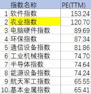 以7月22日收盘的价格统计,WIND的67个细分行业指数中,农业指数今年的涨幅高居第二,仅次于酒类指数;指数PE则达到了惊人的120.70,仅次于软件指数的153.24。