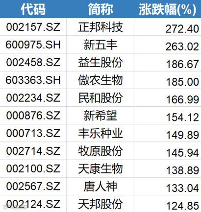 个股方面则牛股频现,新五丰(600975)今年以来上涨263%,牧原股份(002714)上涨161%,丰乐种业(000713)上涨150%,天邦股份(002124)上涨125%,正邦科技(002157)上涨272%,仅翻倍的个股就有两位数,一时间“进击的”农业股成了投资机构和散户的最爱。