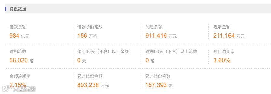 待偿的借款余额为984亿元,借款余额笔数156万笔,利息余额91.14亿元,逾期金额21.12亿元,逾期笔数5.6万笔。
