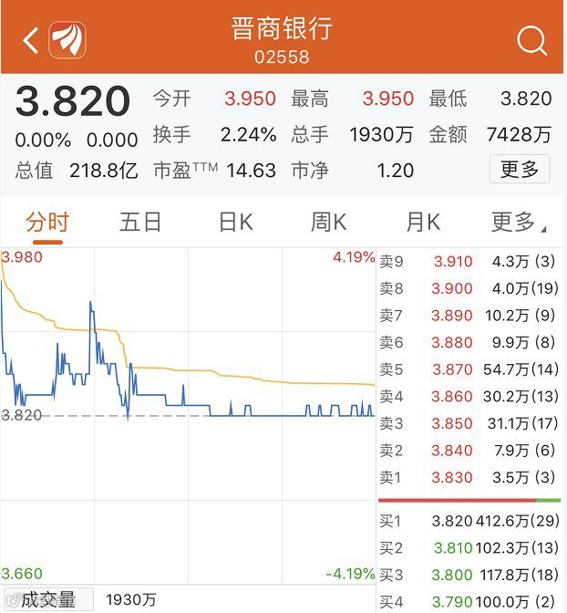 9时30分,晋商银行挂牌开报3.95港元,较招股价3.82港元高约3.4%。