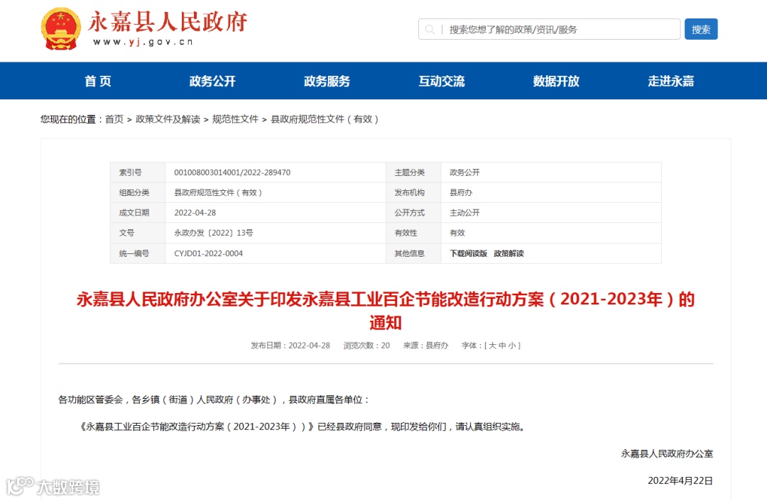 4月28日,永嘉县人民政府发布永嘉县工业百企节能改造行动方案(2021-2023年)的通知,通知指出,到2023年,实施100项节能改造项目,腾出用能空间3000吨标煤,单位规上工业增加值能耗下降6%,新建工业厂房安装分布式光伏比例达到100%,新增光伏并网2万千瓦以上装机容量,实现工业领域能源结构和产业结构双优化。