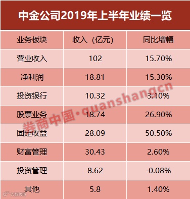 8月23日晚间,中金公司发布2019年半年报,当期实现营业收入102.00亿元,同比增长15.70%;实现净利润18.81亿元,同比增长15.30%。与去年业绩的逆市增长相比,中金公司今年上半年涨幅相对逊色。