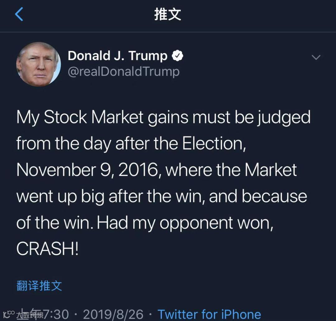 北京时间今天早上7点30分,特朗普发了一条推特。他表示:“我的股票市场收益必须从2016年11月9日选举后开始算起,在我选举胜利之后,市场大幅迎来了大幅上涨。赢得胜利后市场上涨,并且因为获胜。如果我的对手赢了,就崩盘了!”