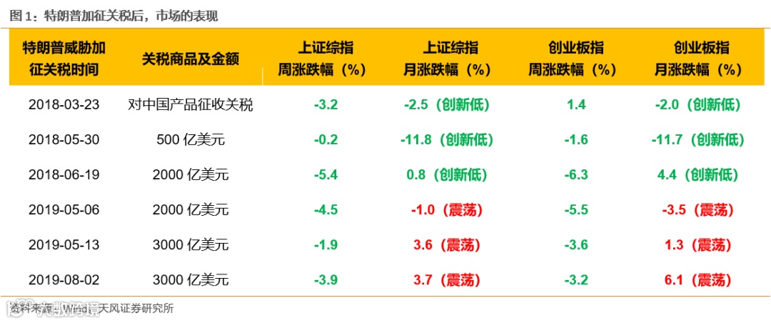 那么,贸易争端导致的市场杀跌对A股又有多大的影响呢?来自天风证券的数据显示如下: