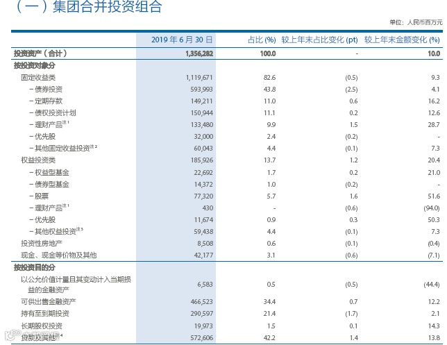 具体到资产配置,至2019年6月30日,太保固定收益类投资占比82.6%,较上年末下降0.5个百分点;权益类投资占比13.7%,较上年末上升1.2个百分点,其中核心权益(包括股票和权益型基金)占比7.4%,较上年末上升1.8个百分点。