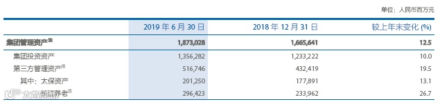 数据显示,截至2019年上半年末,太保集团管理资产达1.87万亿元,较上年末增长12.5%,其中集团投资资产1.36万亿元,较上年末增长10.0%;第三方管理资产5167.46亿元,较上年末增长19.5%;上半年第三方管理费收入7亿元,同比增长39.7%。
