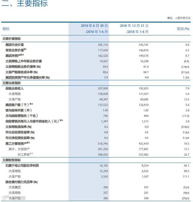 投资收益方面,2019年上半年,太保实现净投资收益296.91亿元,同比增长13.5%,主要是固定收益投资利息收入增加所致;年化净投资收益率4.6%,同比上升0.1个百分点。