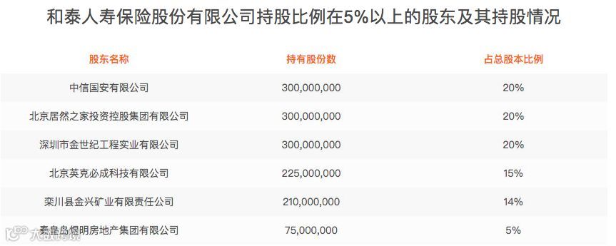 和泰人寿成立于2017年1月,注册资本15亿元,注册在山东济南,主要股东中:中信国安有限公司、居然之家投资控股、深圳市金世纪工程各自持股20%,持股15%的英克必成科技为腾讯100%控股的公司。因此,和泰人寿也被视为“腾讯系”寿险公司。其主要股东中,中信国安、居然之家投资、深圳金世纪持股均20%并列第一大股东,持股15%的英克必成科技则为腾讯100%控股的公司。