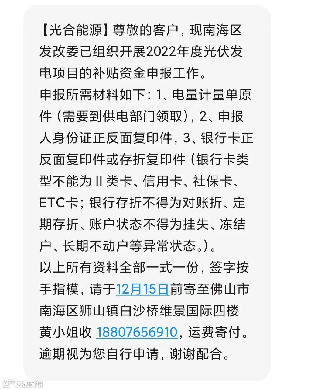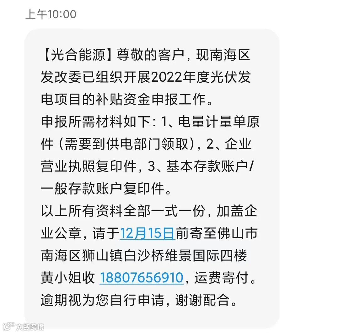 请各用户必须留意我司发出的短信通知!并按照光合能源公司发出的短信要求打印整套申报补助纸质资料邮寄到我司,由我司相关申报专员协助完成补助申报。