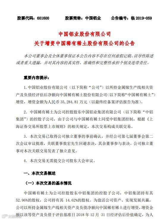 中国铝业对稀土公司的增资,从经营的角度可以理解为该公司希望借助稀土业务来平衡某些领域业务的欠缺,该公司今年上半年净利润7.06亿,同比下滑了14%。处于转型升级中的中国铝业公司需要更多的想象力,增资稀土业务恰恰是市场调整后的绝佳选择。