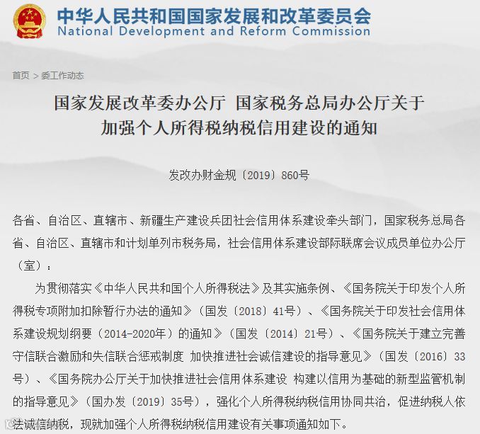 近日,发改委、税务总局联合印发《关于加强个税纳税信用建设的通知》(以下简称《通知》),提出建立健全个税纳税信用记录,完善守信激励与失信惩戒机制。