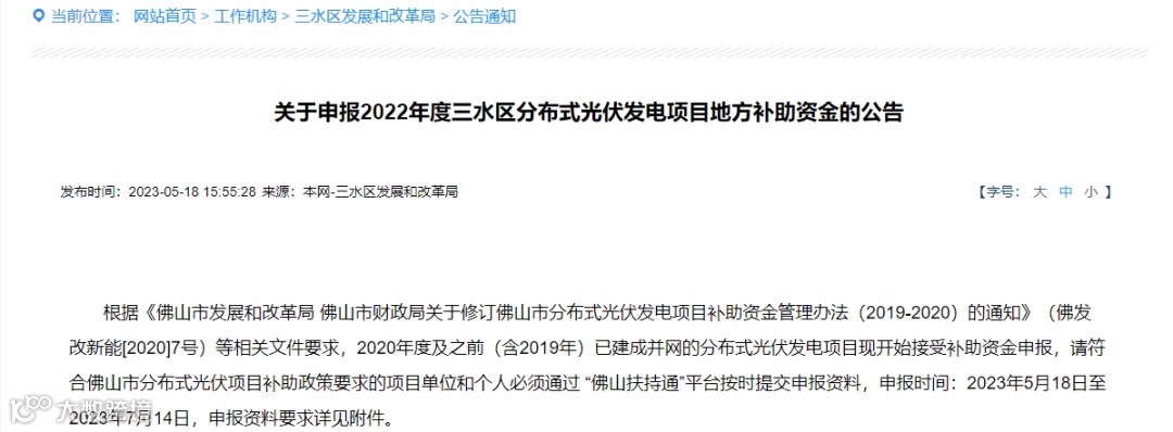 5月18日,佛山市三水区启动2022年度三水区分布式光伏发电项目地方补助资金申报工作;此次可申报补贴的项目范围:2019年1月1日至2020年12月31日并网的居民及工商业分布式光伏项目,附上三水区2022年度光伏补助两种申请途径: