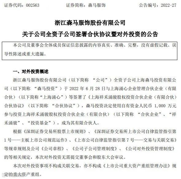 公告称,森马服饰全资子公司森马投资于 2022 年 6 月 28 日与上海涌心等签署了《上海祥禾涌骏股权投资合伙企业(有限合伙) 合伙协议》,森马投资决定使用自有资金人民币 1000 万元参与投资祥禾涌骏,成为其有限合伙人。