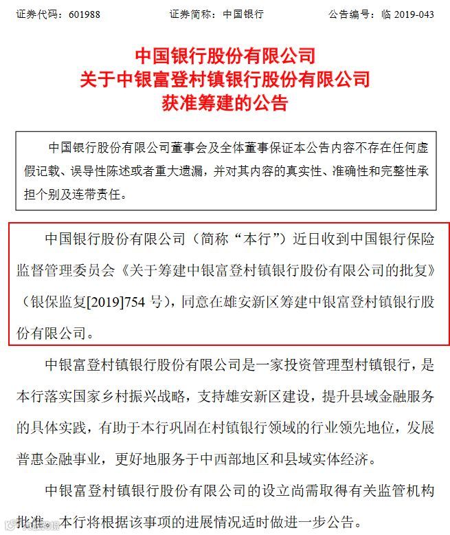 8月21日,中国银行发布公告称,近日收到中国银保监会《关于筹建中银富登村镇银行股份有限公司的批复》,同意在雄安新区筹建中银富登村镇银行股份有限公司(下简称“中银富登村镇银行”),中银富登村镇银行是一家投资管理型村镇银行。