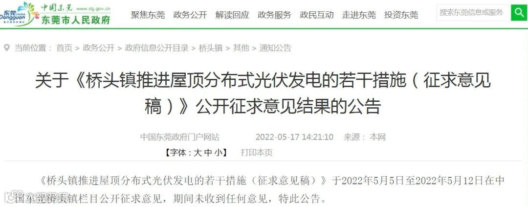 5月17日,东莞市人民政府发布公告称,《桥头镇推进屋顶分布式光伏发电的若干措施(征求意见稿)》于2022年5月5日至2022年5月12日在中国东莞桥头镇栏目公开征求意见,期间未收到任何意见,特此公告。