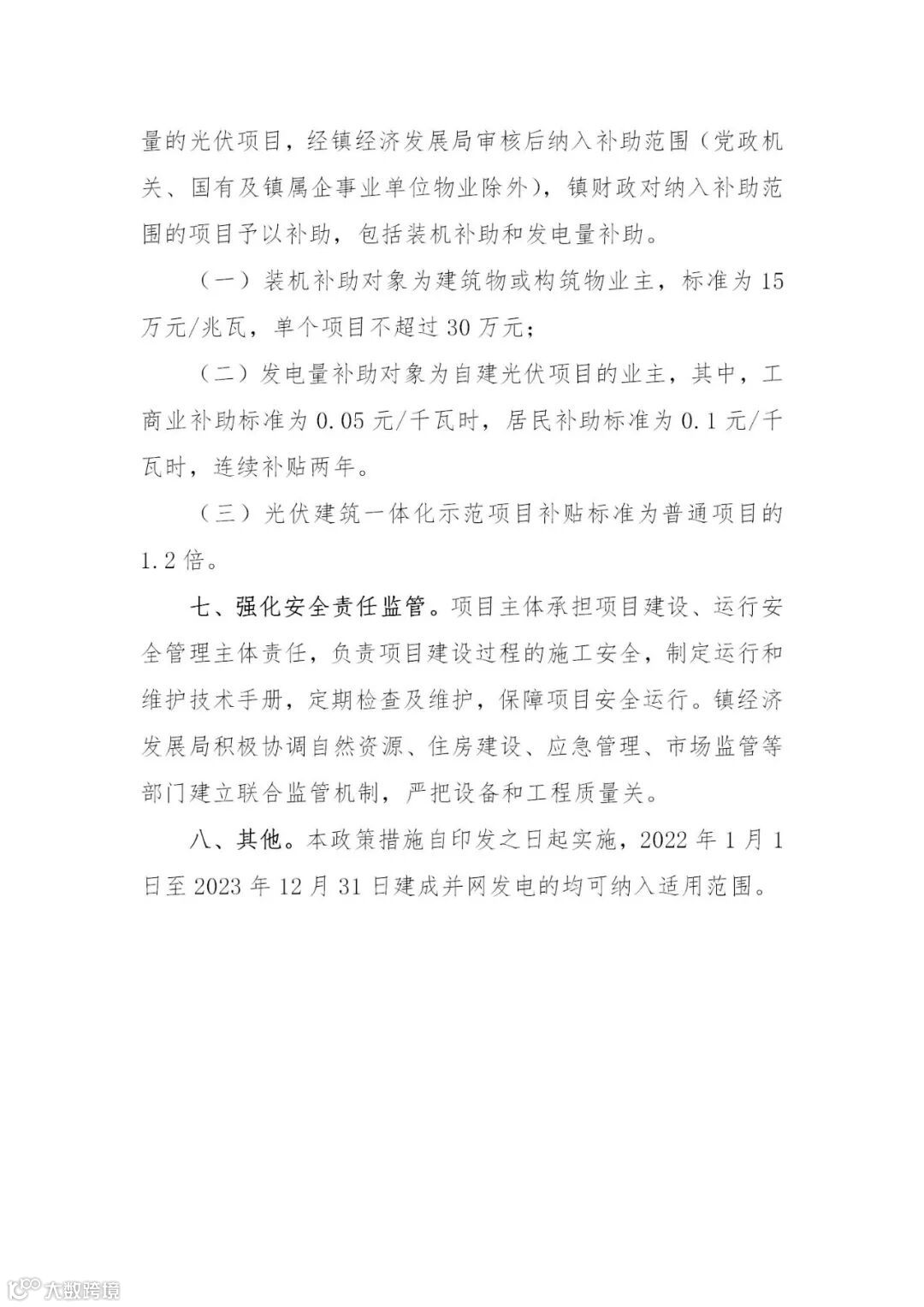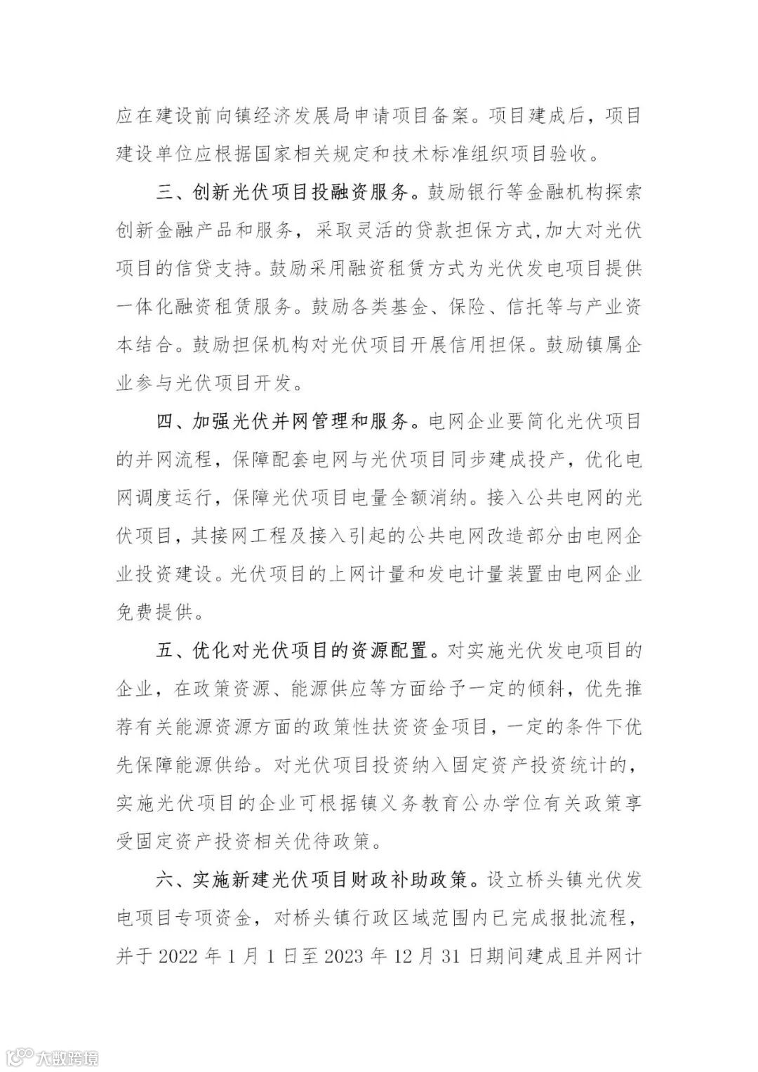 值得注意的是,文件提出,实施新建光伏项目财政补助政策。设立桥头镇光伏发电项目专项资金,对桥头镇行政区域范围内已完成报批流程,并于2022年1月1日至2023年12月31日期间建成且并网计量的光伏项目,经镇经济发展局审核后纳入补助范围(党政机关、国有及镇属企事业单位物业除外),镇财政对纳入补助范围的项目予以补助,包括装机补助和发电量补助。