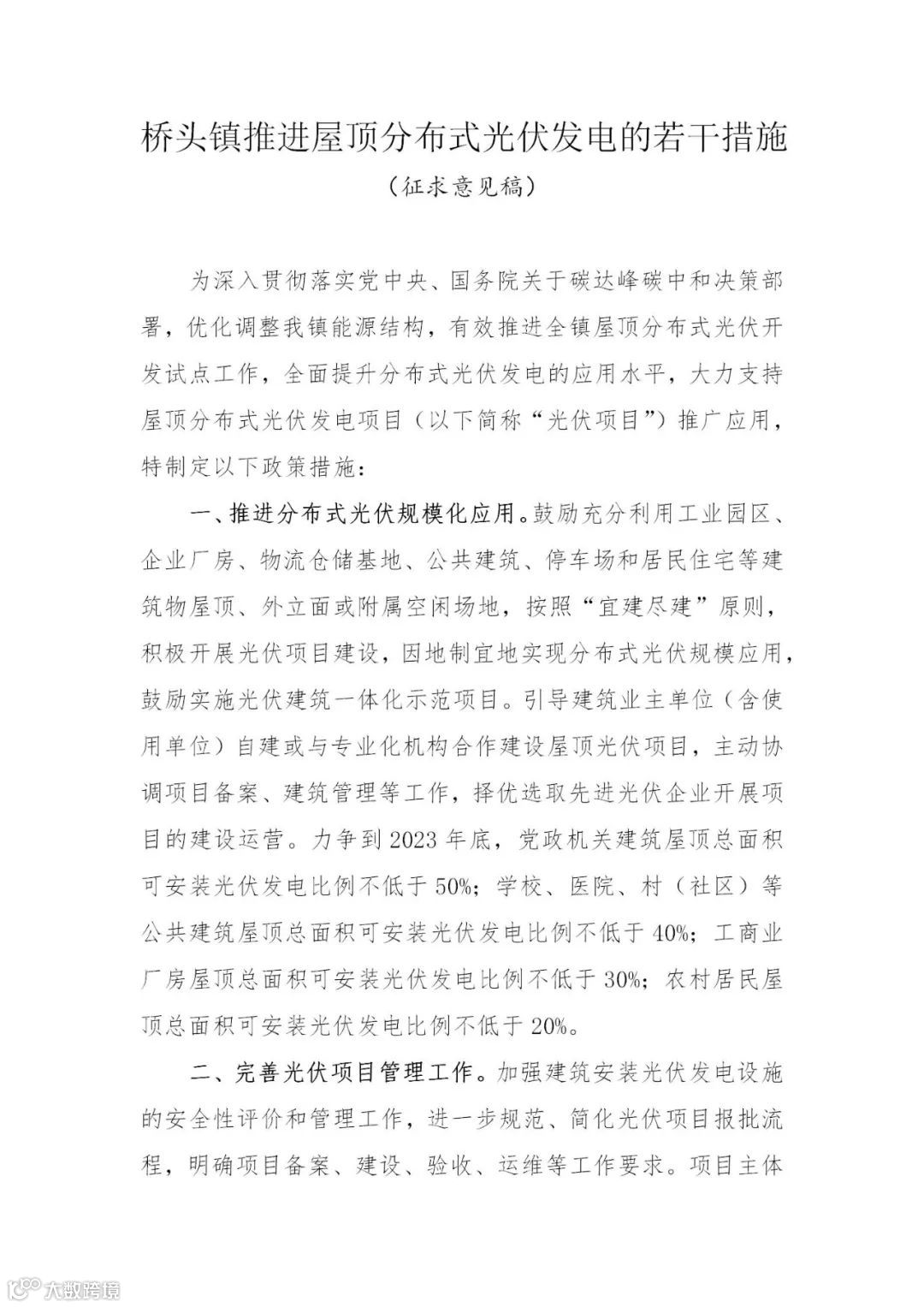 5月5日,东莞市人民政府曾就《桥头镇推进屋顶分布式光伏发电的若干措施(征求意见稿)》公开征求意见。意见明确,力争到2023年底,党政机关建筑屋顶总面积可安装光伏发电比例不低于50%;学校、医院、村(社区)等公共建筑屋顶总面积可安装光伏发电比例不低于40%;工商业厂房屋顶总面积可安装光伏发电比例不低于30%;农村居民屋顶总面积可安装光伏发电比例不低于20%。