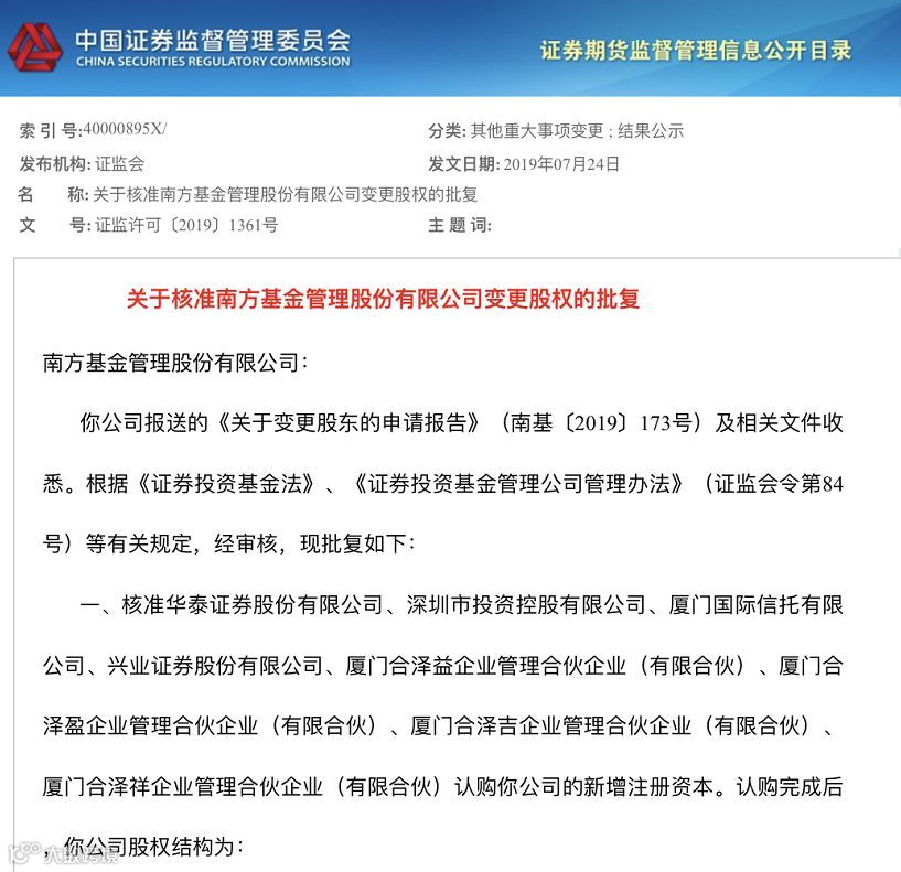 7月25日,证监会发布了《关于核准南方基金管理股份有限公司变更股权的批复》。