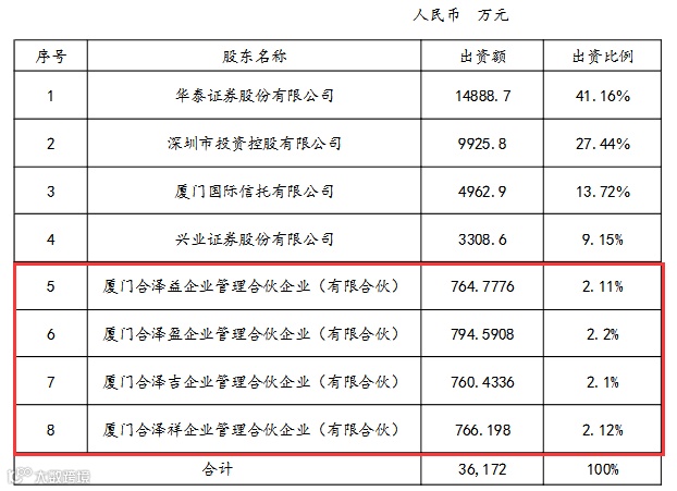 本次股东增资由华泰证券、深圳投控、厦门国际信托、兴业证券等四家原股东和厦门合泽吉企业管理合伙企业(有限合伙)等四家作为员工持股主体的新股东共同实施。员工通过四家有限合伙企业合计间接持有公司股份8.53%。