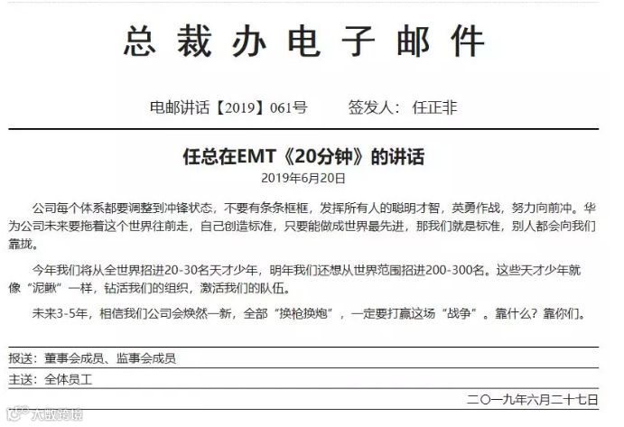 华为6月27日发布全员邮件,披露了任正非在EMT《20分钟》的讲话,任正非说,“今年我们将从全世界招20-30名天才少年,明年我们还想从世界范围招进200-300名。这些天才少年就像‘泥鳅’一样,钻活我们的组织,激活我们的队伍。”他说,“华为公司未来要拖着这个世界往前走,自己创造标准,只要能做成世界最先进,那我们就是标准,别人都会向我们靠拢。”
