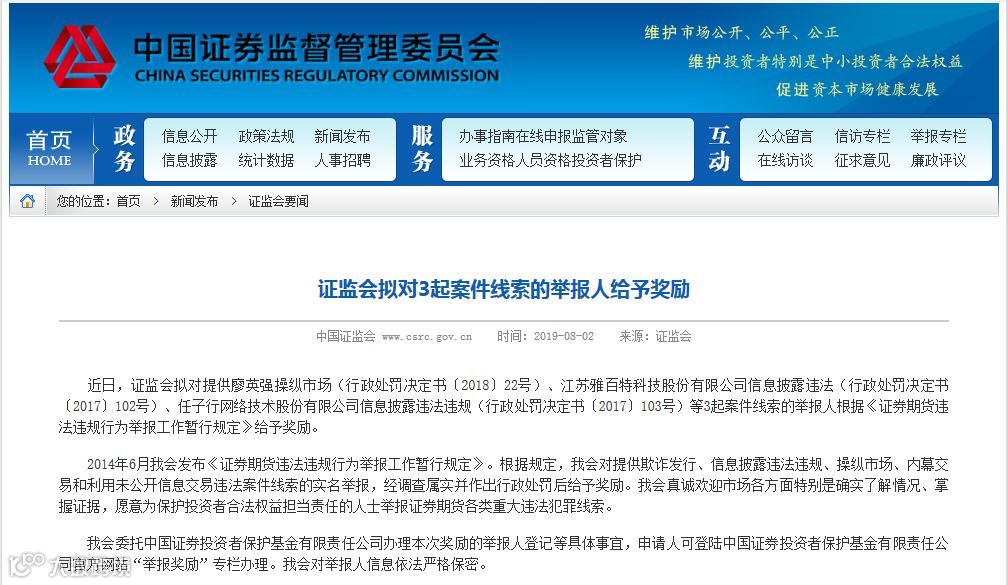 8月2日,证监会公告显示,证监会拟对提供廖英强操纵市场案、江苏雅百特科技股份有限公司信息披露违法案、任子行网络技术股份有限公司信息披露违法违规案等3起案件线索的举报人给予奖励。