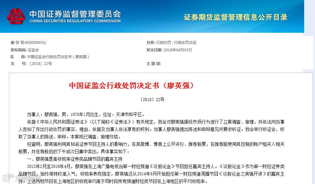 2018年4月份,开给著名“财经网红”廖英强的天价处罚,曾令市场津津乐道。对于廖英强操纵市场的违法事实,证监会决定对其没收违法所得4310.48万元,并处8620.95万元罚款,合计金额高达1.29亿元。