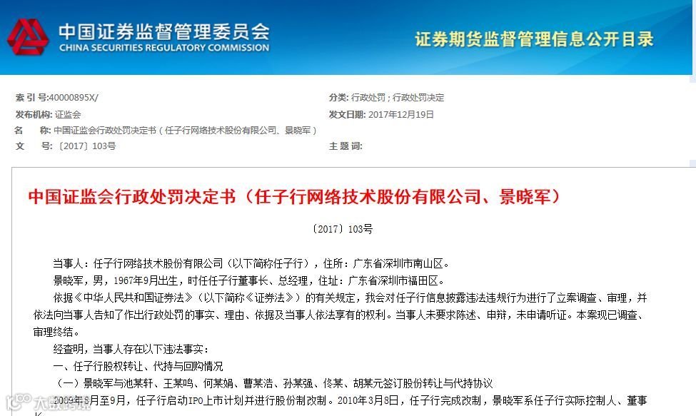根据处罚决定书,在任子行IPO上市之前,公司董事长景晓军与他人签订股权转让与代持协议,并于2014年回购相关股份。但任子行未曾准确、完整披露上述情况。其行为构成信息披露违法。对此,证监会决定对任子行给予警告,并处以30万元的罚款;对景晓军给予警告,并处以30万元的罚款。