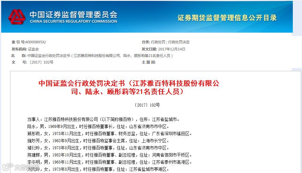 2017年12月,证监会对雅百特及21名责任人员作出行政处罚决定,对公司处以60万罚款,对其余相关责任人员处以警告并3-30万元罚款。此外,对相关人员作出市场进入决定。