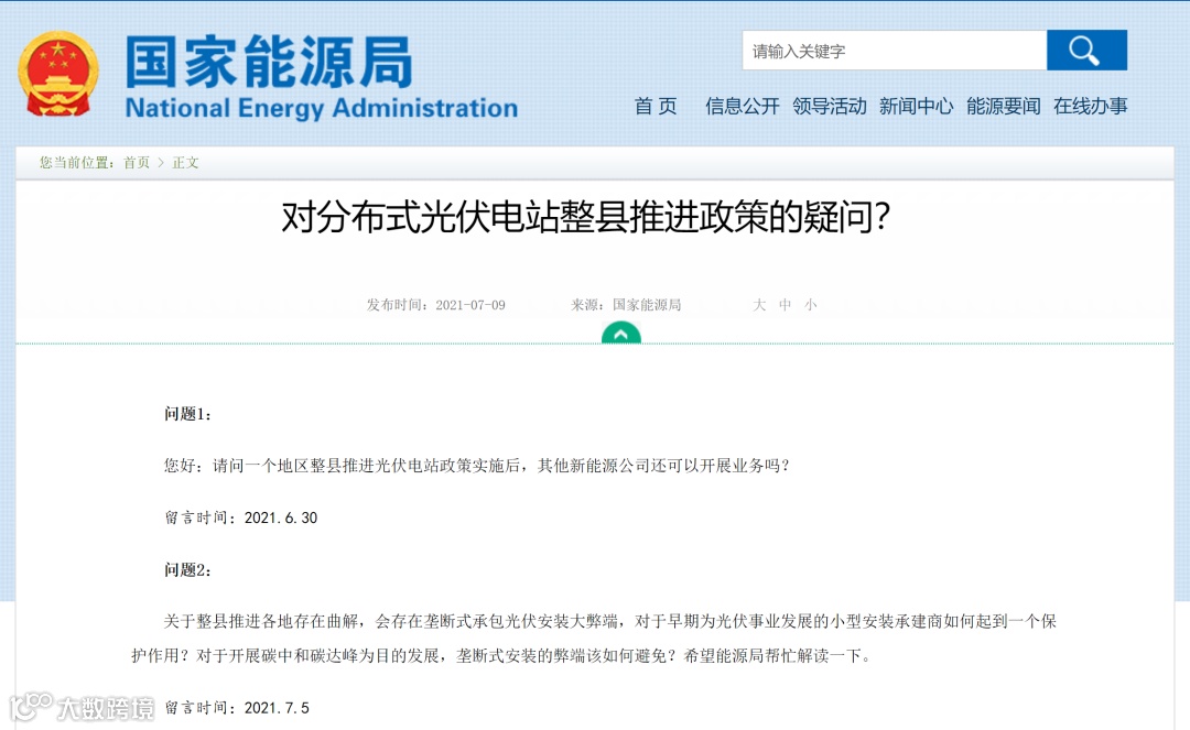 7月5日,国家能源局官网就“对分布式光伏电站整县推进政策的疑问”进行答复。国家能源局表示,整县(市、区)屋顶分布式光伏推进工作中,要把握好几个方面: