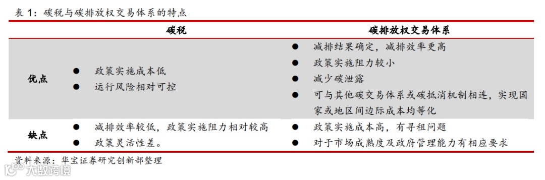 碳税指政府指定碳价,市场决定最终排放水平,故最终排放量的大小具有不确定性;碳排放权交易体系指政府确定最终排放水平,由市场来决定碳价,故碳价大小是不确定的。 正是由于这种区别,两种手段具有不同的特点。开征碳税更适用于管控小微排放端,碳排放权交易体系则适用于管控排放量较大的企业或行业。这两种政策是可以结合使用的。