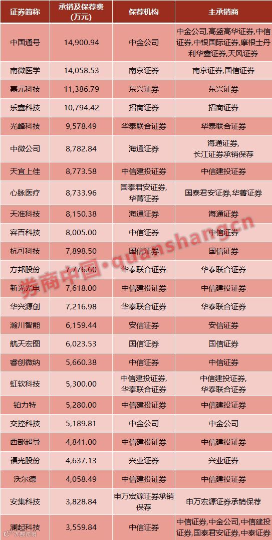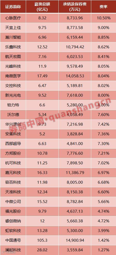具体来看,中国通号、南微医学两家企业的承销保荐费用比较接近,以1.49亿元和1.41亿元分列前两位,但其承销保荐费率却相差甚远,分别为1.42%和8.04%;此外,嘉元科技、乐鑫科技的承销保荐费分别为1.14亿元和1.08亿元,也超过了亿元大关。