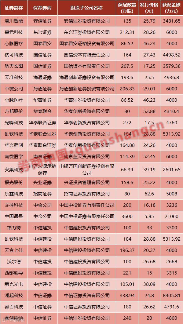 券商中国记者根据此次25家科创板上市企业的跟投情况统计来看,共有15家券商旗下子公司作为战略投资者参与跟投,获配金额自2600万元至2.11亿元不等,合计跟投规模约为13.74亿元。