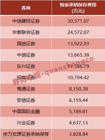 由于目前尚未有资料显示联合保荐和联合承销的分配比例,因此券商中国记者仅根据19个由一家券商独家完成承销保荐的案例,来粗略梳理各家券商的收费情况(其余6家企业未纳入统计)。