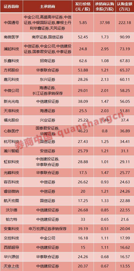 具体来看,中国通号由于网上弃购股份较多,此次承销商需认购37.98万股,共计认购金额为222.18万元。其次是南微医学,虽然承销商认购余股数量不多,但由于发行价较高,认购金额也达到了90.99万元。