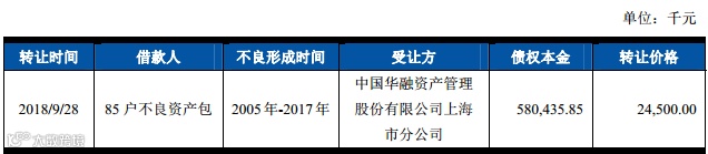 此外,这期间,除上述不良贷款转让外,本行还对由85户已核销贷款组成的不良贷款包进行了批量转让。该笔批量转让系通过上海联合产权交易所挂牌、网络竞价的公开转让,具体情况如下表所示: