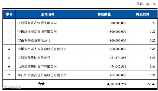 招股书显示,截至2019年5月31日,上海国际集团持有该行481,474,285股,持股占比5.55%,其全资子公司上海国资经营和上海国际资管分别持有该行8亿股和3.2亿股,分别占该行总股本的9.22%和3.69%,三者合计持有该行16.018亿股,占本行总股本的18.46%,为该行合并第一大股东。