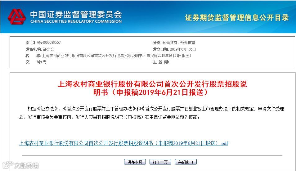 7月5日,证监会官网披露了上海农商行IPO招股书,该行A股上市计划又进了一步。