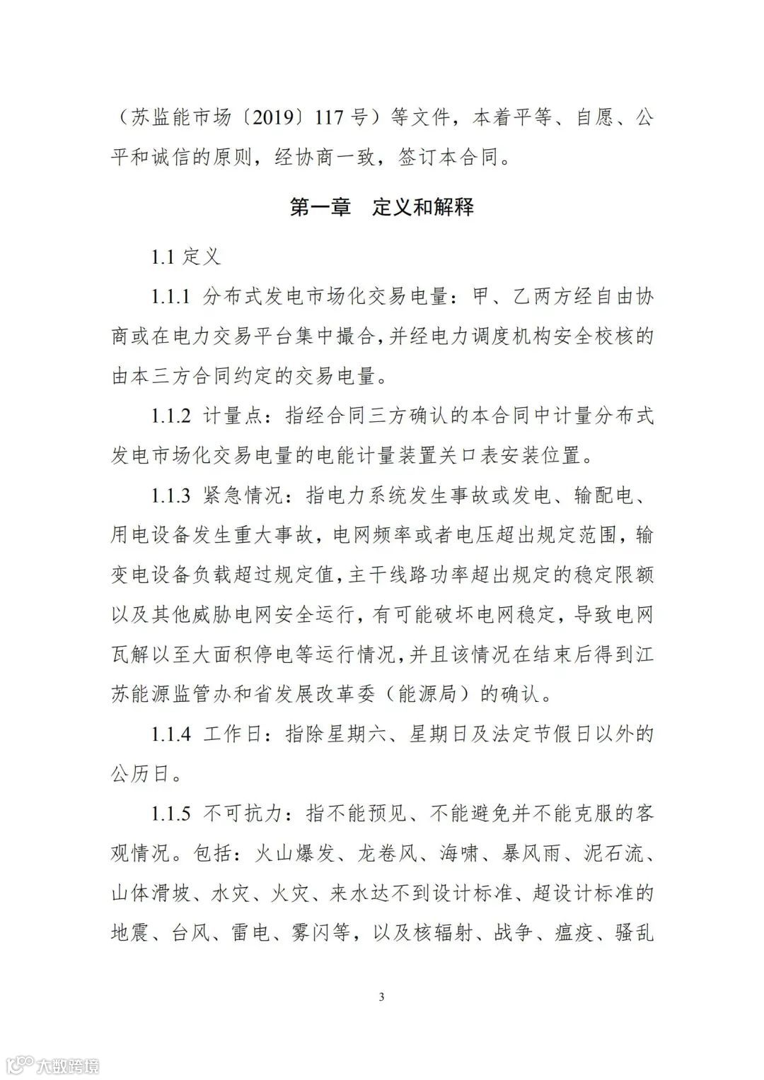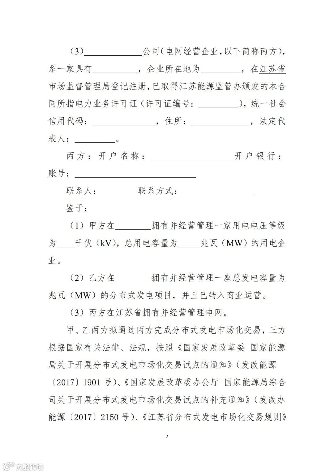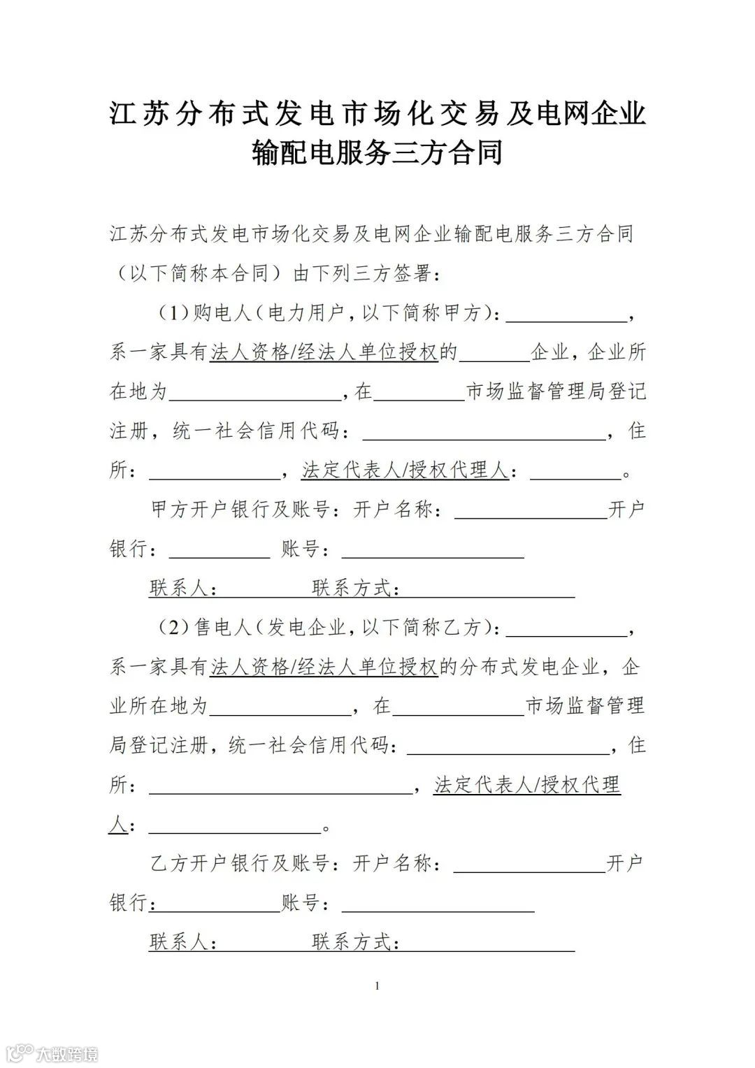 2020年12月7日,江苏能监办印发了《江苏分布式发电市场化交易及电网企业输配电服务三方合同(示范文本)》,各有关单位可在开展分布式发电市场化交易工作时参照使用。