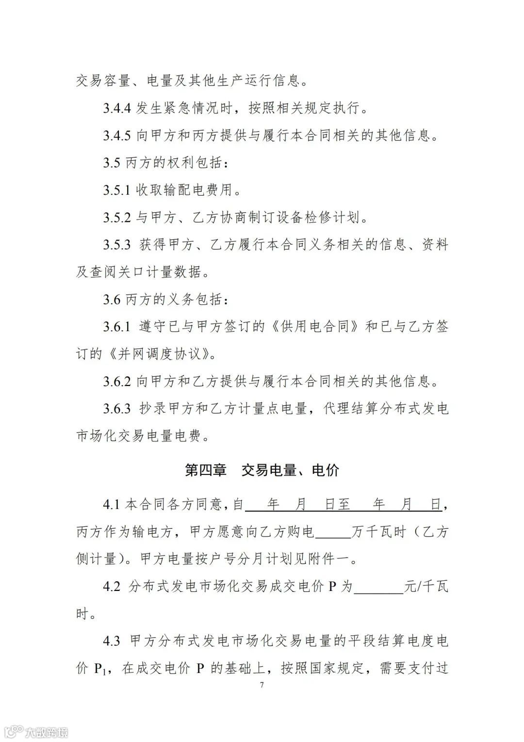 为规范江苏分布式发电市场化交易,根据《中共中央国务院关于进一步深化电力体制改革的若干意见》(中发〔2015〕9号)和电力体制改革配套文件、《国家发展改革委国家能源局关于开展分布式发电市场化交易试点的通知》(发改能源〔2017〕1901号)、《国家发展改革委办公厅国家能源局综合司关于开展分布式发电市场化交易试点的补充通知》(发改办能源〔2017〕2150号)、《江苏省分布式发电市场化交易规则》(苏监能市场〔2019〕117号)等文件,我办编制了《江苏分布式发电市场化交易及电网企业输配电服务三方合同(示范文本)》,现予印发。请各有关单位在开展分布式发电市场化交易工作时参照使用,在执行中若有相关问题可及时与我办联系。